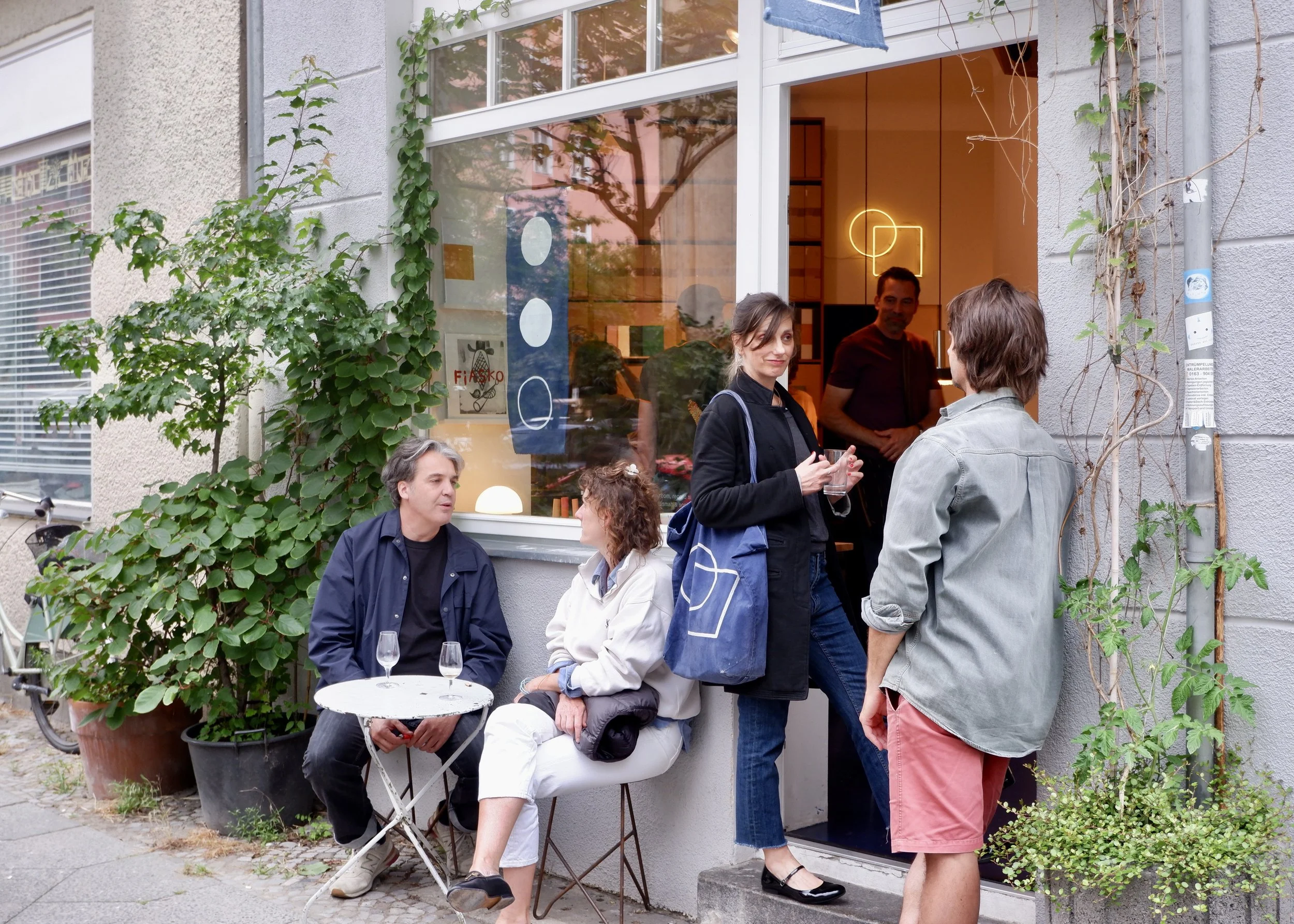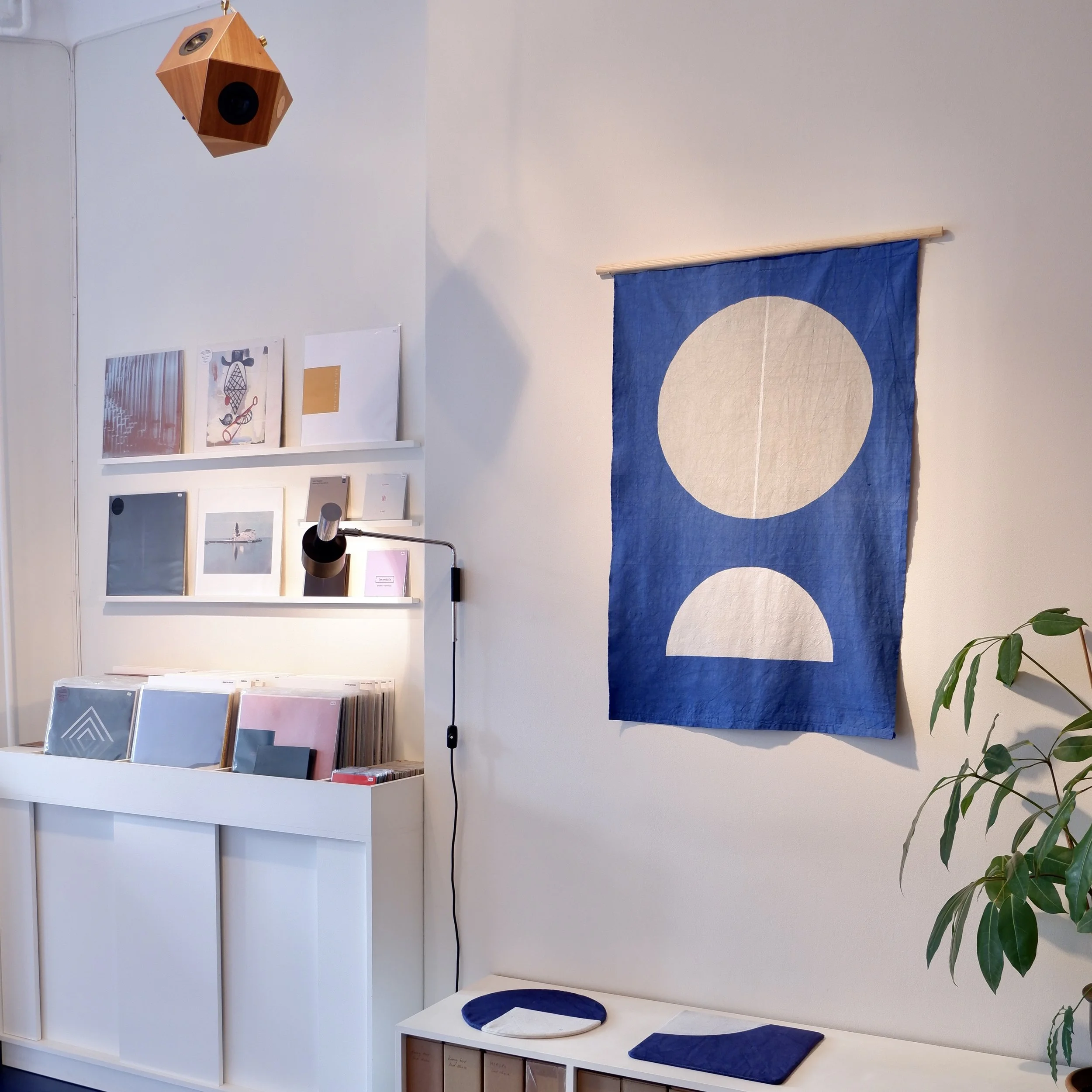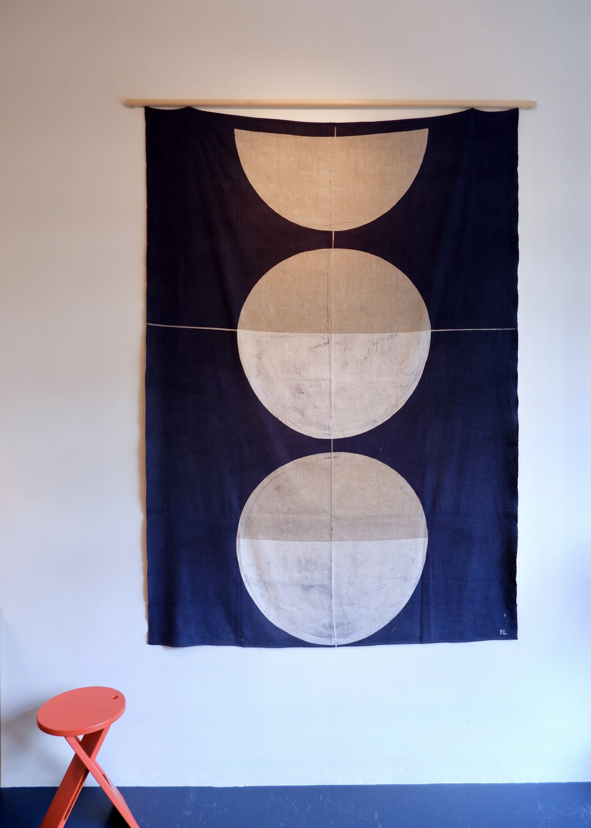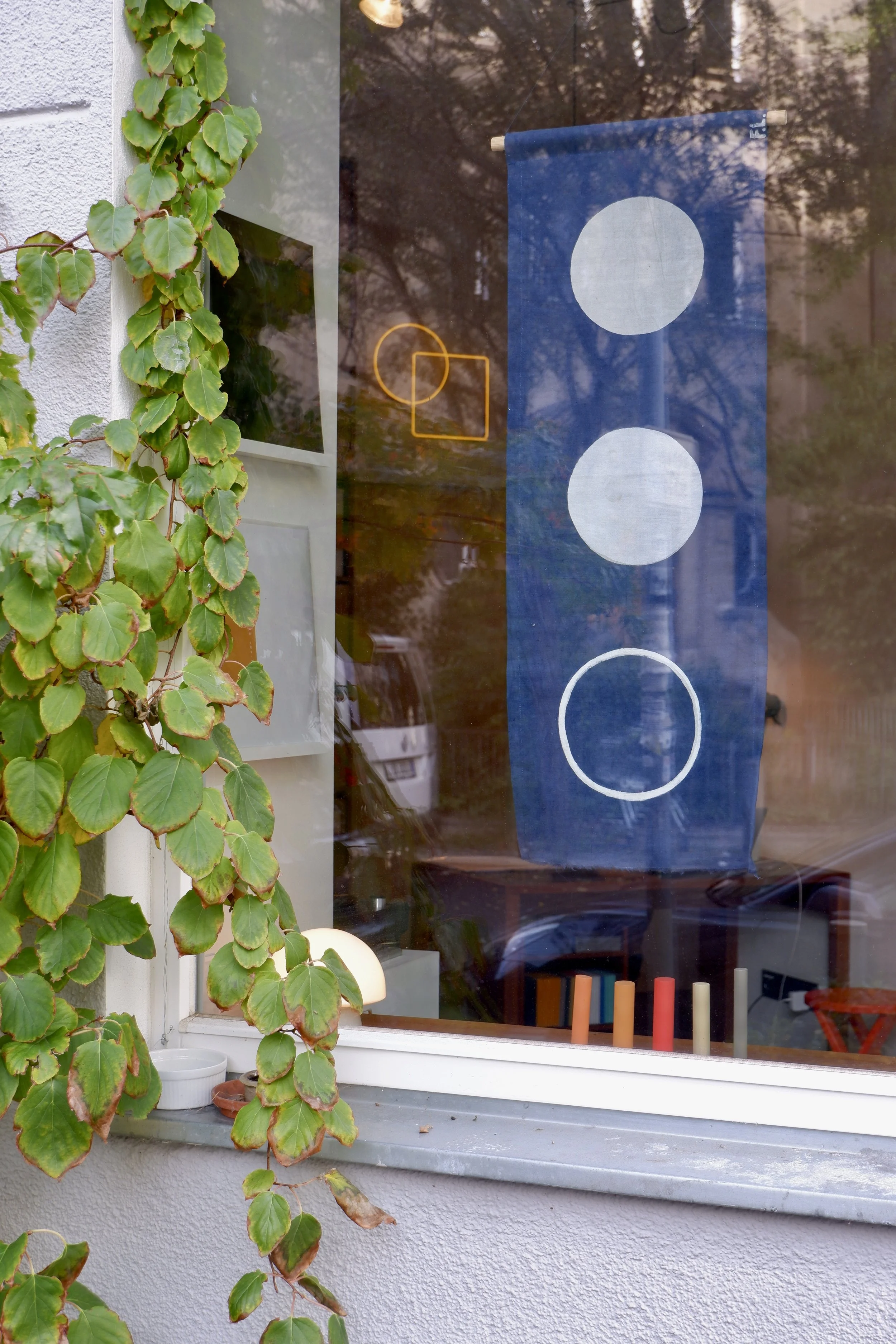 The artist and designer Franziska Lutze lives and works in Berlin. For her textile works she uses a historical, traditional dyeing technique, called blue printing (Blaudruck in German). Franziska collaborates with the oldest blue printing company in Europe, which has existed in Einbeck since 1638. She reinterprets this dyeing technique, which has been part of the Unesco World Heritage since 2018, in her own way and only uses natural textiles such as cotton or linen. In contrast to the floral and folkloristic patterns of traditional blue printing, Franziska´s work focuses on clear and minimal shapes. She arranges these into geometric compositions. Her artistic process is intuitive and handcrafted. The individual pieces shine in UV-true (predominantly) primary colours.