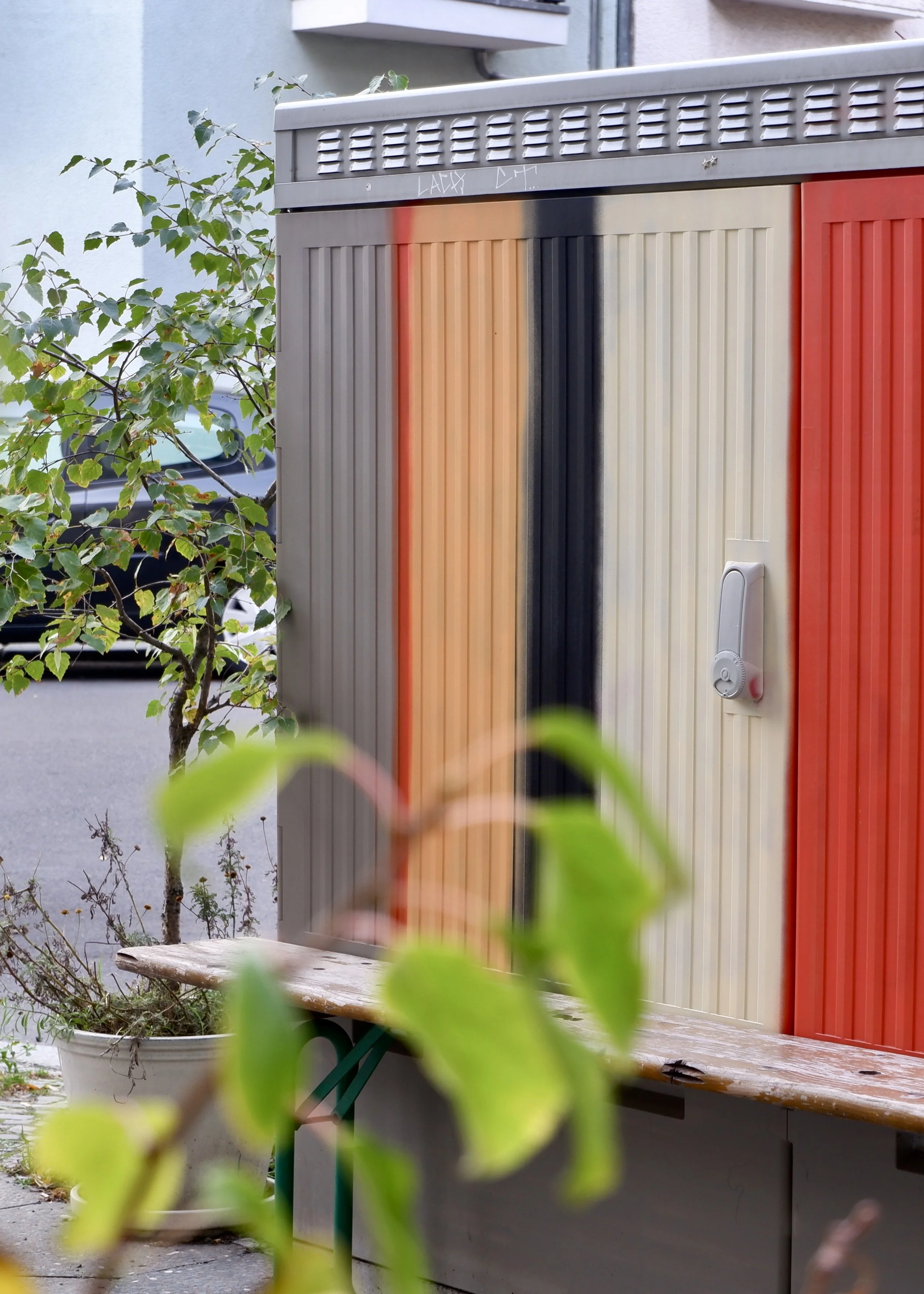 Franziska also painted the electric box outside our store in the same colours as the chairs