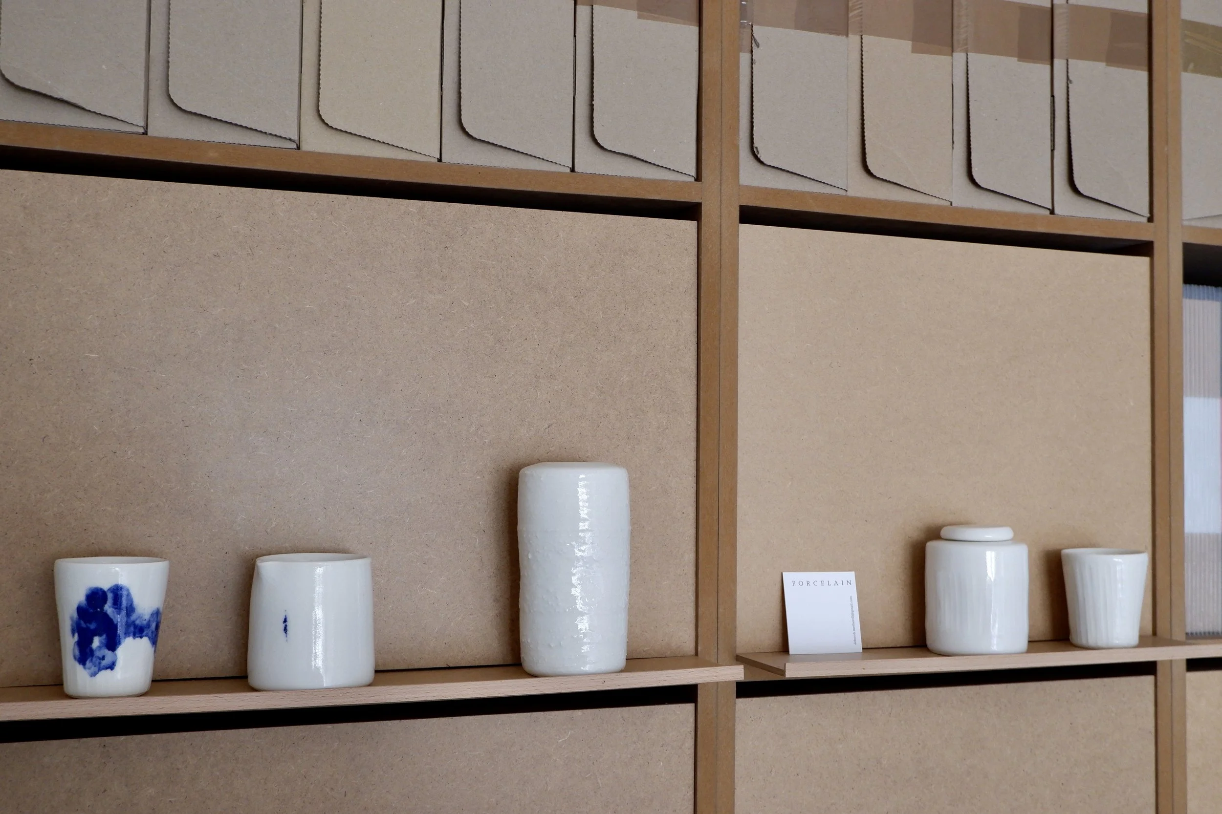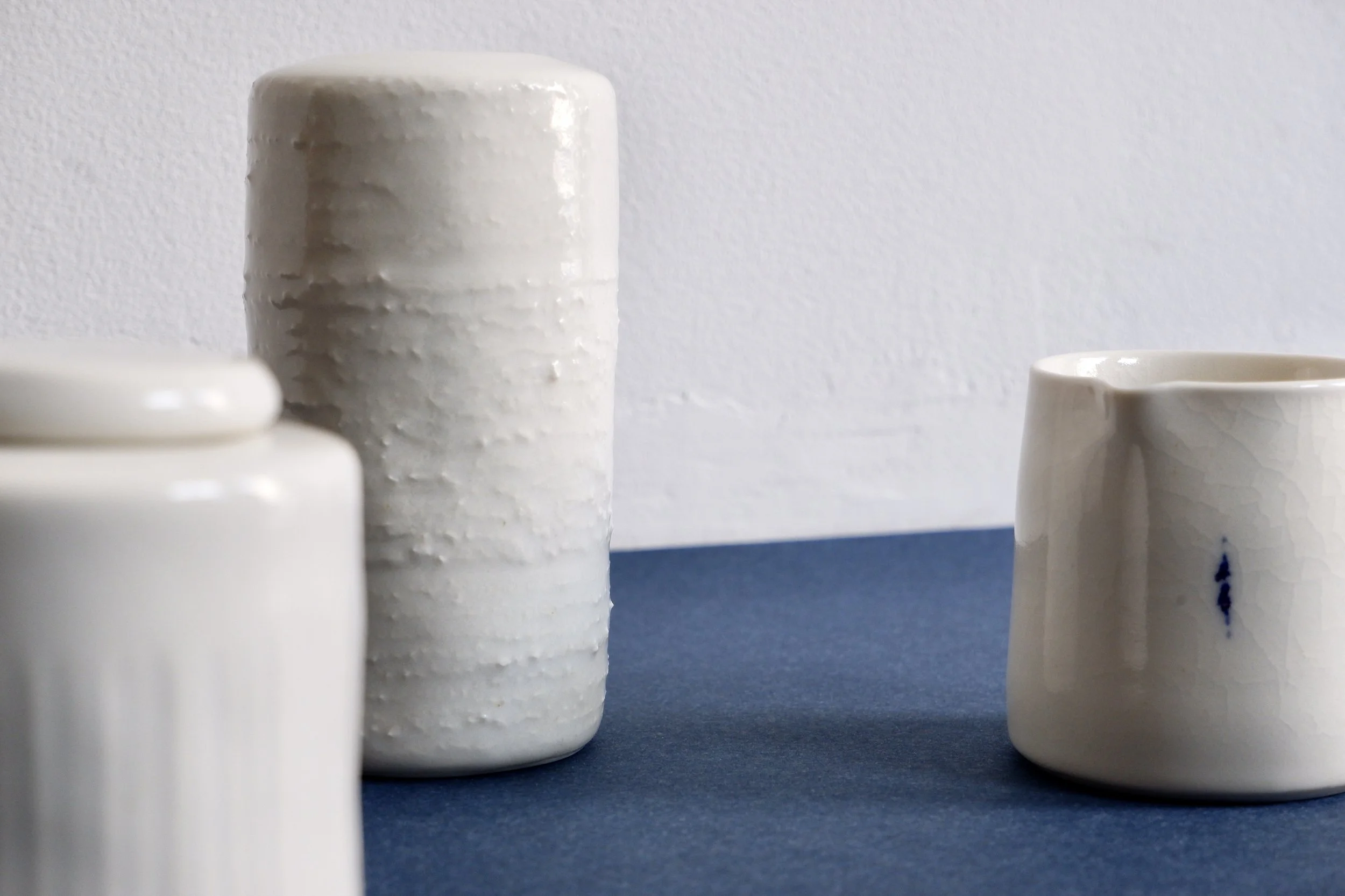 The pieces are made from porcelain, thrown on a pottery wheel, where traces of the throwing and making process are kept to become part of the final aesthetic of the objects. The glazes are plain, resonant of the idea of a blank canvas, where the viewer then searches for details or character within the glaze; or there is delicate mark-making which is then allowed to take on its own form during the firing and melting process.